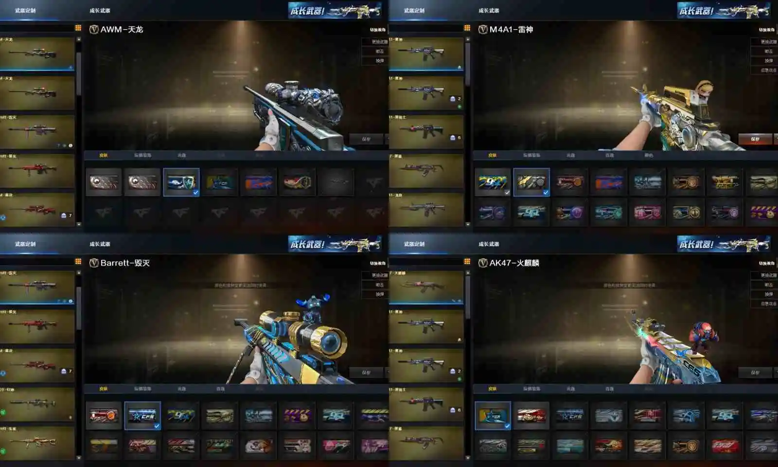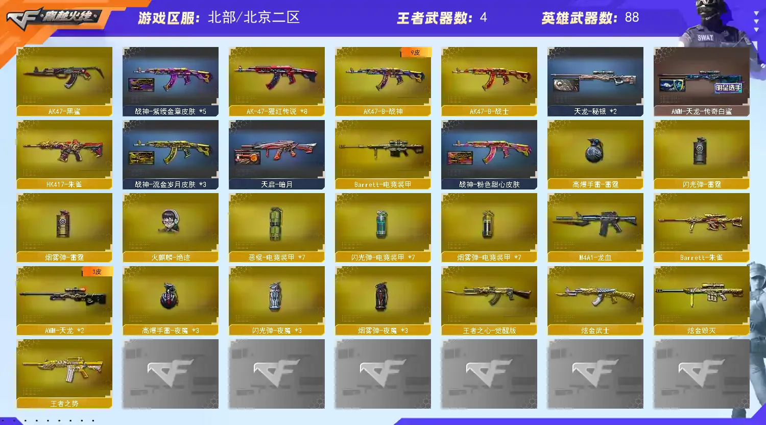 【其他重要武器】炫金武士/炫金毁灭/炫金修罗/M4A1-英雄-能量核心/M4A1-秘银赤龙(5)/M4A1-战龙/AK47-枪娘/AK47-QT/M4A1-紫狱(2)/AK47-娜塔莎/雷神-赛博朋克/M14EBR-赤血龙魂/AK47-SS-枪王排位/HK417-红龙/AK-103-红色悦动/AK47-圣诞节[2019]/9A91-赤血龙魂(3)/AK47-破空冰刃/AK47-B-十周年/黄金AK-47/AK47-肯德基/AK47-樱花/M200-赤血龙魂(3)/AWM-S/AWM-恶棍-枪王排位(2)/Barrett-翔龙(2)/暗金M200/AWM-Pink/AWM-A/M200-万圣节/破天狂龙/KAC-小动物/KAC-赤烛/雷蛇冲锋枪/Spas-12-黑金/阐释者III/愤怒公牛左轮-枪王排位/新USP-枪王排位奖励(4)/COP 357-平天大圣/COP-金蝉子-枪王排位/新USP-怒火大圣/幻影Anaconda-枪王排位/Anaconda-炽焰核心(2)/沙鹰-枪王排位/蝴蝶刀-枪王排位/幻影扳手-枪王排位/丛林匕首-卧龙(4)/丛林匕首-枪王排位/闪光弹-枪王排位/胜利奖杯烟雾弹-枪王排位