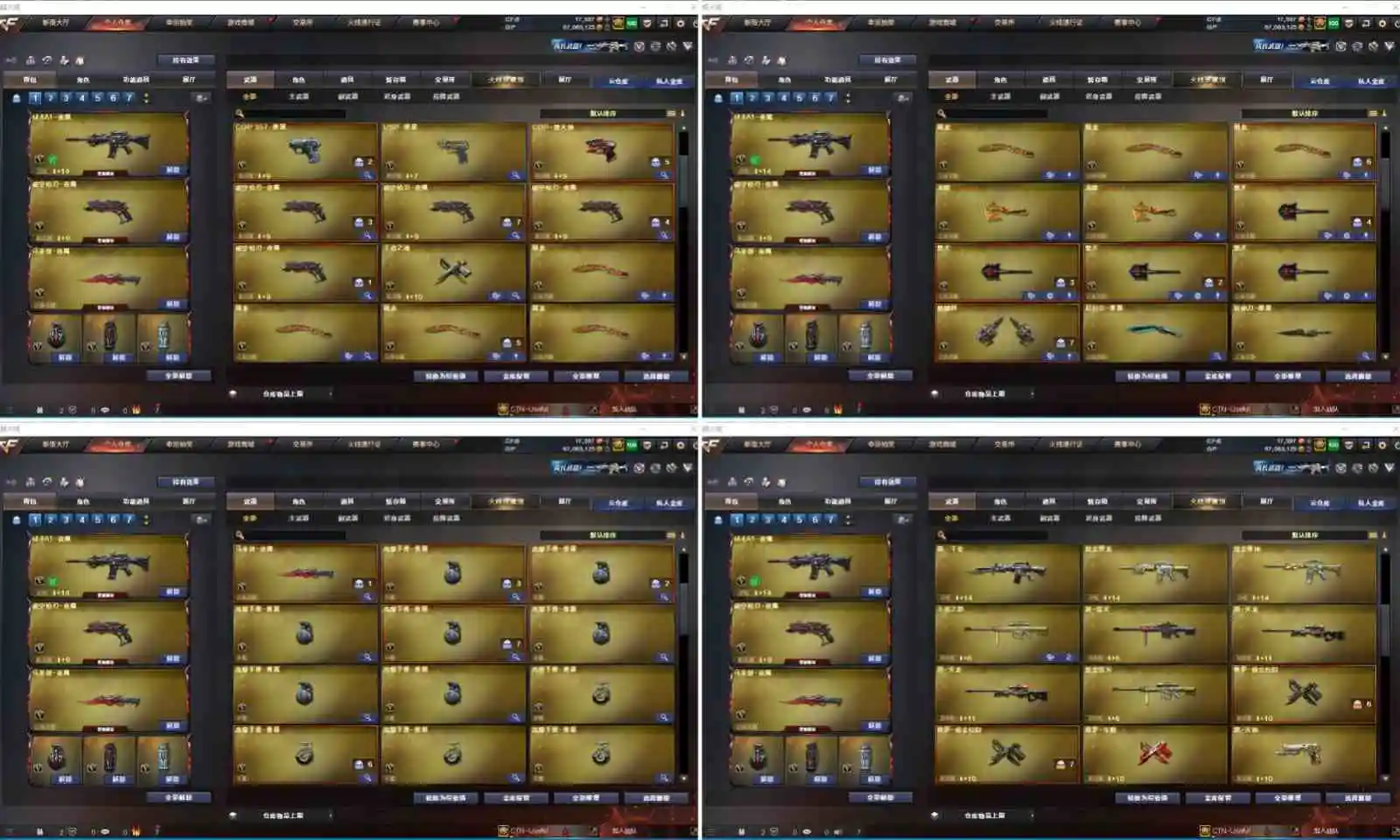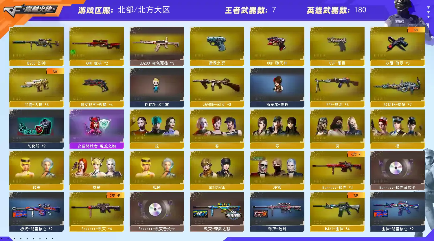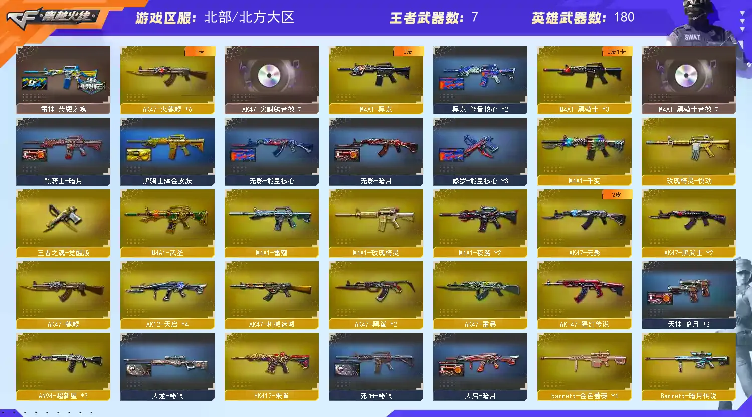 【其他重要武器】炫金黑龙/炫金雷神/炫金毁灭/炫金修罗/黑武士-能量核心(5)/黑骑士-摸金校尉(2)/M4A1-英雄-能量核心/M4A1-仙界-黑骑士/激光毁灭者III(2)/9A91-2017万圣节/黄金AK-47/AK47-樱花/M4A1-青龙./AK47-青龙/AK47-轮回/AK47-十年火线(2)/9A91-蓝色骑士(2)/M4A1-樱/M4A1-樱花/M4A1-XS-翔龙/AK47-SS-9周年/AK-12-CFS2017纪念版/M4A1-战龙/AK47-肯德基/AK47-万圣节2018(2)/56式步枪-梨花/AK47-B-十周年/M4A1-秘银赤龙(5)/雷神-赛博朋克/AK47-娜塔莎/AK12-枪王排位(2)/M14EBR-情人节2020/M4A1-紫狱/火麒麟-桃园结义/AK47-SS-枪王排位(2)/红龙AK47/AK47-枪娘/M14EBR-CFS 2020/9A91-赤血龙魂/M4A1-XS-耀龙/9A-91翡翠/M4A1-肯德基/M4A1-情人节2019(2)/M4A1-电音/G3A3-SS-枪王排位/M4A1-十年火线/HK417-赤血龙魂/M14EBR-赤血龙魂/AK47-破空冰刃(2)/M4A1-PINK/AK47枪王排位II/神罚/AWM-十周年/破天狂龙(2)/AWM-7周年/AWM-2018圣诞/凤凰之力(2)/M200-圣诞(3)/FN弩炮-CFS2017纪念版/AWM-圣诞2013/98K-蓝色骑士/AWM-A/AWM-万圣节刀锋/AWM-红色悦动/AWM-恶棍-枪王排位(3)/AWM-S/M200-赤血龙魂(4)/破天九龙/M200-大黄蜂/M82A1-红龙/AWM-蓝水晶(2)/M200-万圣节2018(3)/AWM-涂鸦/AWM-Pink/M200-万圣节/AWM-枪娘/Barrett-翔龙/AWM-A枪王排位II/雷蛇AWM/巨龙咆哮Ⅲ/MG4-蓝色骑士/KAC-小动物(2)/KAC-耀龙/斯太尔-能量核心/EVO III-赤血龙魂/斯泰尔-巧克力/神圣爆裂者/Spas-12-黑金/凤凰之灵(3)/愤怒公牛左轮-枪王排位(2)/沙鹰-万圣节2018(2)/新USP-枪王排位奖励(4)/COP 357--绚樱/修罗-摸金校尉(2)/幻影沙鹰-枪王排位/幻影Anaconda-枪王排位/迷彩沙鹰-70KG/沙鹰-枪王排位(3)/凤凰之火/沙鹰-雷蛇/COP 357-青龙/鹰爪-枪王排位/军用铁锹-赤龙(2)/收割者-枪王排位(2)/幻影扳手-枪王排位/尼泊尔-炎龙/丛林匕首-枪王排位(2)/蝴蝶刀-枪王排位/尼泊尔-CFS 2020/军用铁锹-飞龙在天/闪光弹-枪王排位(5)/手雷-能量核心(2)