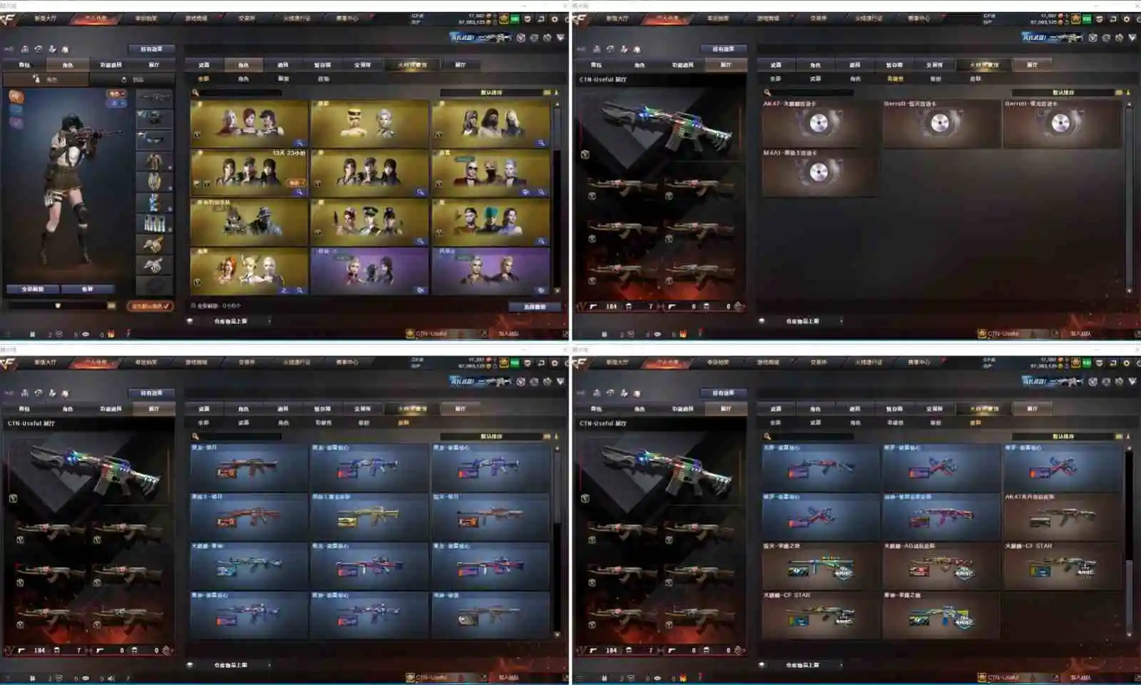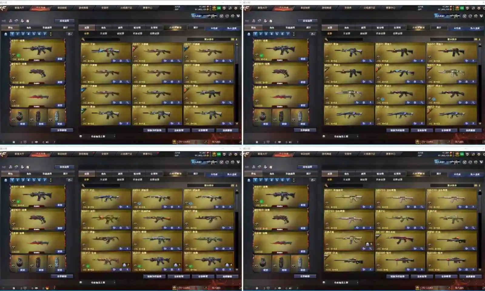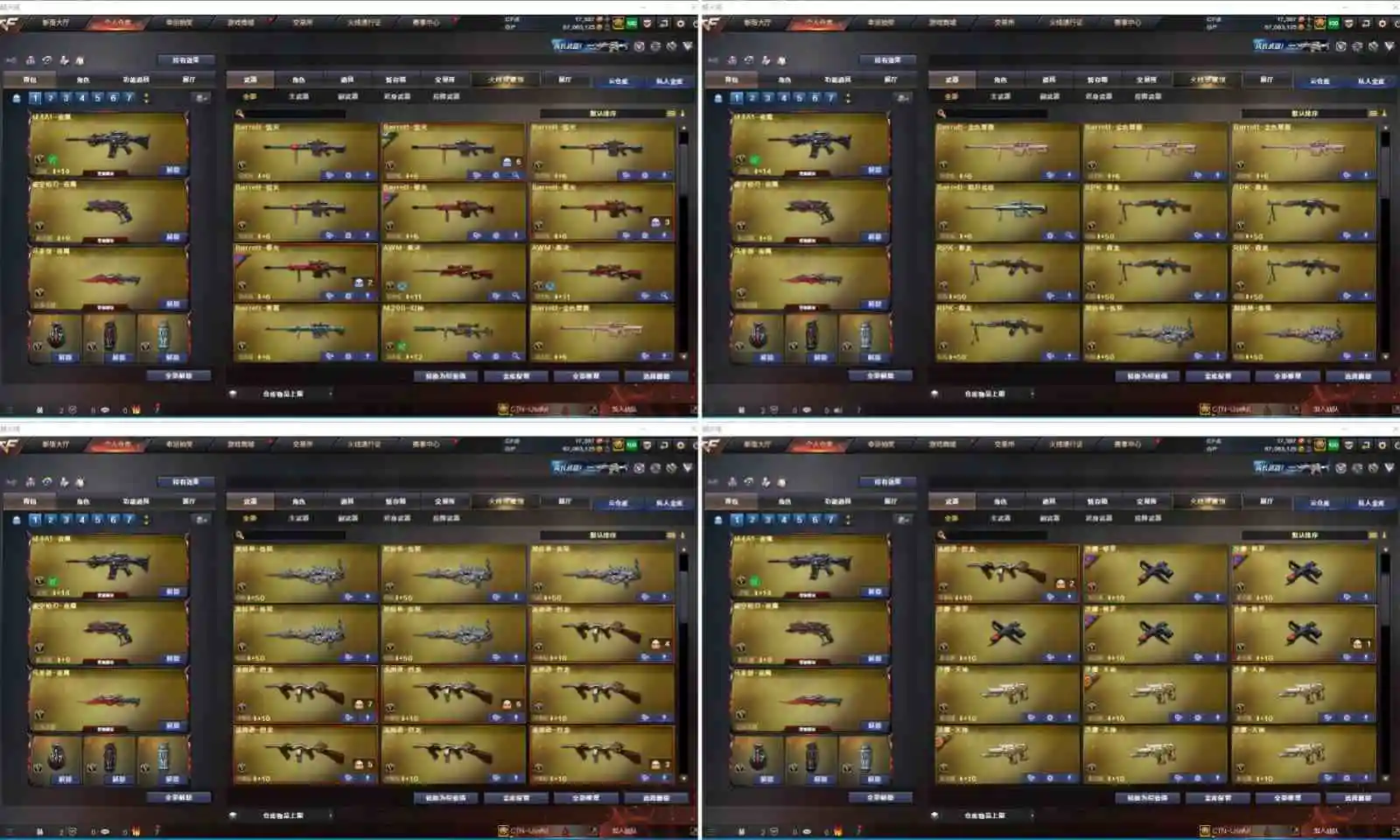 【其他重要武器】炫金黑龙/炫金雷神/炫金毁灭/炫金修罗/黑武士-能量核心(5)/黑骑士-摸金校尉(2)/M4A1-英雄-能量核心/M4A1-仙界-黑骑士/激光毁灭者III(2)/9A91-2017万圣节/黄金AK-47/AK47-樱花/M4A1-青龙./AK47-青龙/AK47-轮回/AK47-十年火线(2)/9A91-蓝色骑士(2)/M4A1-樱/M4A1-樱花/M4A1-XS-翔龙/AK47-SS-9周年/AK-12-CFS2017纪念版/M4A1-战龙/AK47-肯德基/AK47-万圣节2018(2)/56式步枪-梨花/AK47-B-十周年/M4A1-秘银赤龙(5)/雷神-赛博朋克/AK47-娜塔莎/AK12-枪王排位(2)/M14EBR-情人节2020/M4A1-紫狱/火麒麟-桃园结义/AK47-SS-枪王排位(2)/红龙AK47/AK47-枪娘/M14EBR-CFS 2020/9A91-赤血龙魂/M4A1-XS-耀龙/9A-91翡翠/M4A1-肯德基/M4A1-情人节2019(2)/M4A1-电音/G3A3-SS-枪王排位/M4A1-十年火线/HK417-赤血龙魂/M14EBR-赤血龙魂/AK47-破空冰刃(2)/M4A1-PINK/AK47枪王排位II/神罚/AWM-十周年/破天狂龙(2)/AWM-7周年/AWM-2018圣诞/凤凰之力(2)/M200-圣诞(3)/FN弩炮-CFS2017纪念版/AWM-圣诞2013/98K-蓝色骑士/AWM-A/AWM-万圣节刀锋/AWM-红色悦动/AWM-恶棍-枪王排位(3)/AWM-S/M200-赤血龙魂(4)/破天九龙/M200-大黄蜂/M82A1-红龙/AWM-蓝水晶(2)/M200-万圣节2018(3)/AWM-涂鸦/AWM-Pink/M200-万圣节/AWM-枪娘/Barrett-翔龙/AWM-A枪王排位II/雷蛇AWM/巨龙咆哮Ⅲ/MG4-蓝色骑士/KAC-小动物(2)/KAC-耀龙/斯太尔-能量核心/EVO III-赤血龙魂/斯泰尔-巧克力/神圣爆裂者/Spas-12-黑金/凤凰之灵(3)/愤怒公牛左轮-枪王排位(2)/沙鹰-万圣节2018(2)/新USP-枪王排位奖励(4)/COP 357--绚樱/修罗-摸金校尉(2)/幻影沙鹰-枪王排位/幻影Anaconda-枪王排位/迷彩沙鹰-70KG/沙鹰-枪王排位(3)/凤凰之火/沙鹰-雷蛇/COP 357-青龙/鹰爪-枪王排位/军用铁锹-赤龙(2)/收割者-枪王排位(2)/幻影扳手-枪王排位/尼泊尔-炎龙/丛林匕首-枪王排位(2)/蝴蝶刀-枪王排位/尼泊尔-CFS 2020/军用铁锹-飞龙在天/闪光弹-枪王排位(5)/手雷-能量核心(2)