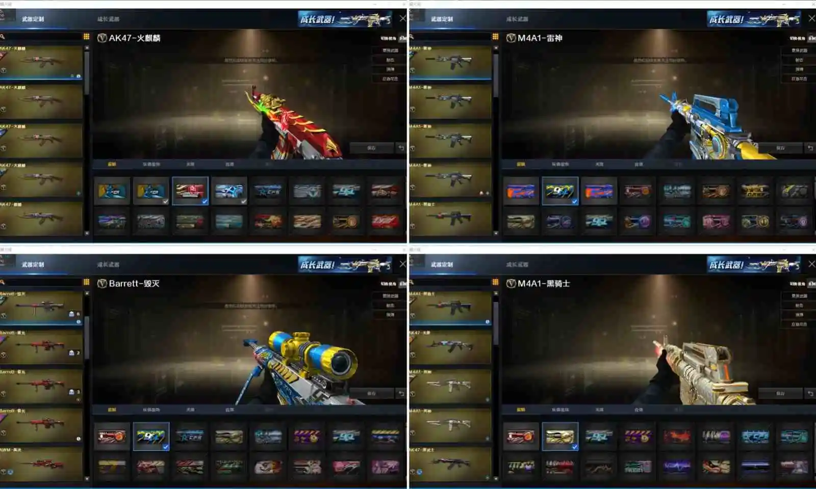 【重要武器皮肤】毁灭-荣耀之怒/毁灭-暗月/极光-能量核心/天龙-秘银/火麒麟-CFSTAR/火麒麟-AG/无影-暗月/无影-能量核心/AK-47-雷神/雷神-荣耀之魄/雷神-能量核心/黑骑士耀金皮肤/黑骑士-暗月/黑龙-暗月/黑龙-能量核心/死神-秘银/天启-暗月/战神-紫绶金章皮肤/修罗-能量核心/天神-暗月