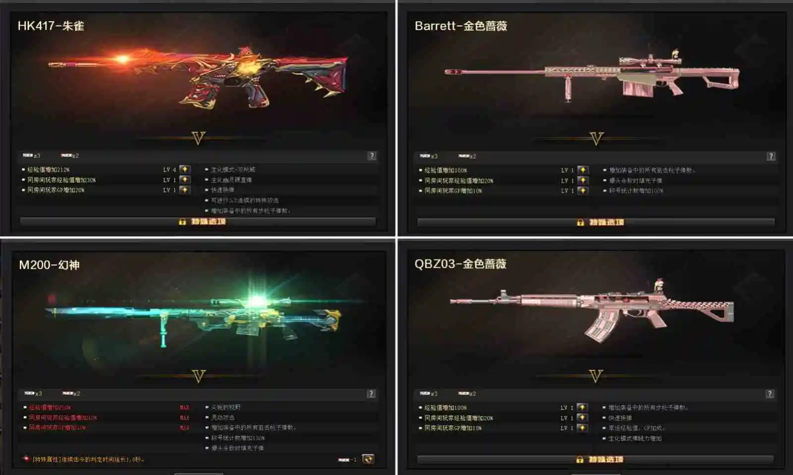 【英雄武器】_M200-幻神/Barrett-毁灭(6)/Barrett-极光(3)/barrett-金色蔷薇(4)/Barrett-暗月传说/雷霆之怒/AWM-天龙(2)/AWM-裁决(2)/M4A1-雷神(4)/M4A1-死神(2)/M4A1-黑龙/M4A1-千变/M4A1-黑骑士(3)/M4A1-武圣/M4A1-夜魔(2)/M4A1-雷霆/M4A1-玫瑰精灵/王者之魄-觉醒版/王者之武-觉醒版/HK417-朱雀/AK12-天启(4)/AK47-火麒麟(6)/AK47-无影/AK47-雷暴/AK47-麒麟/AK47-黑鲨(2)/AK47-黑武士(2)/AK-47-猩红传说/AK47-机械迷城/AN94-超新星(2)/QBZ03-金色蔷薇(3)/王者之心-觉醒版/RPK-盘龙(6)/汤姆逊-烈龙(8)/加特林-炼狱(7)/COP-堕天神/雷霆之契/沙鹰-天神(6)/沙鹰-修罗(5)/王者之魂-觉醒版/破空枪刃-夜魔(4)/USP-雷暴/麒麟刺/龙啸(2)/擎天(4)/屠龙(7)/雷霆之锋/马来剑-夜魔/斩神刀-雷暴/高爆手雷-雷暴(7)/高爆手雷-雷霆(7)/高爆手雷-夜魔(7)/烟雾弹-雷暴(7)/烟雾弹-雷霆(7)/烟雾弹-夜魔(7)/闪光弹-雷暴(7)/闪光弹-雷霆(7)/闪光弹-夜魔(7)