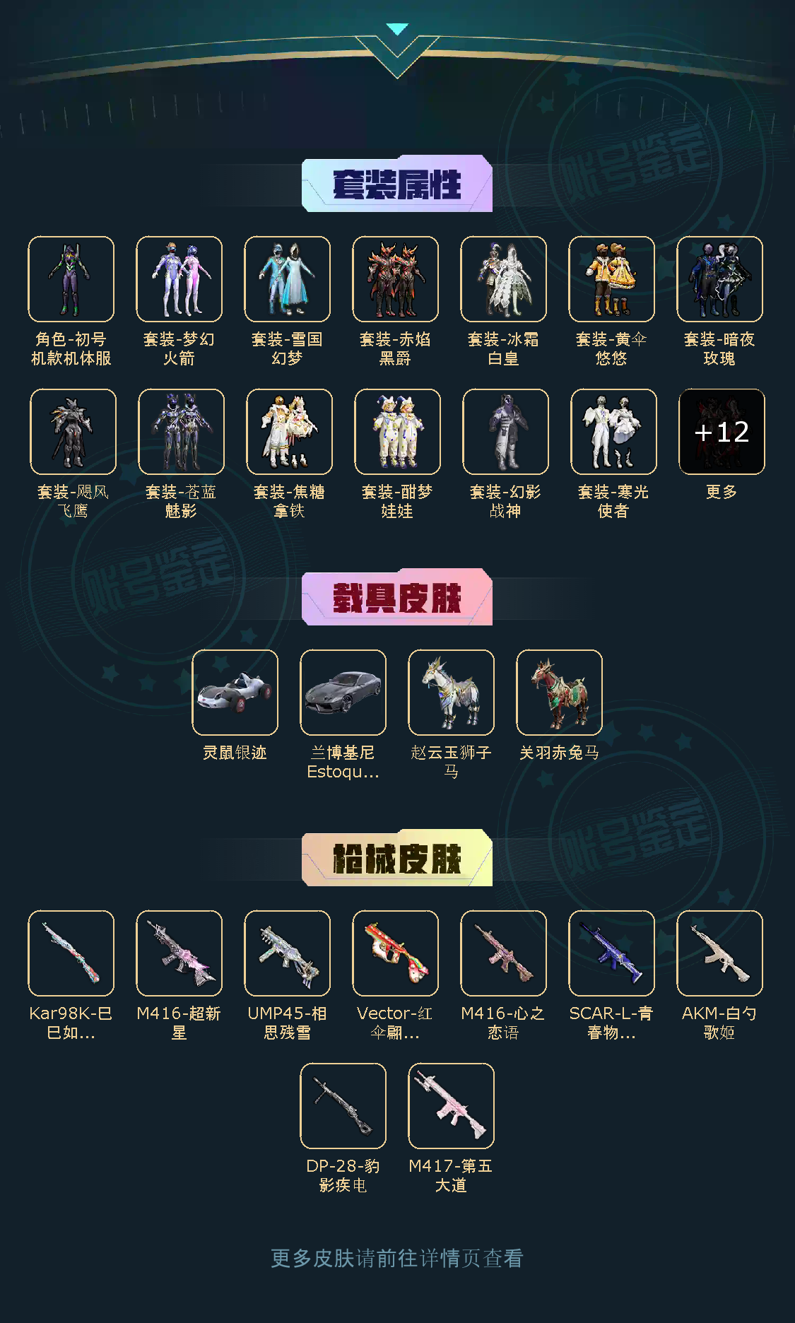 【稀有资产】角色-初号机款机体服/套装-雪国幻梦/M416-心之恋语/M416-超新星/角色-明日香款战斗服/角色-薰款战斗服/巡查员上衣/套装-深海小丑鱼/套装-奇异狩猎者/套装-暗夜魅影/套装-粉红小猪/套装-雪山精英/套装-龟仙人/套装-迅捷狂鲨/套装-六号树人/套装-星河浪客/套装-动感兔斯基人偶服/套装-狂沙舞者/套装-冷酷挑战者/套装-西部牛仔/大砍刀-青龙偃月刀/撬棍-龙胆亮银枪