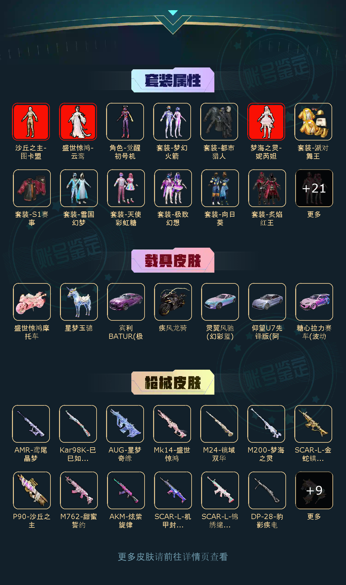 【稀有资产】沙丘之主-图卡盟[3级]/盛世惊鸿-云鸾[2级]/梦海之灵-妮芮妲[2级]/套装-雪国幻梦/角色-千金淑猫/套装-彩虹甜喵/套装-第五大道/套装-甜梦小狐/M416-心之恋语/AUG-星梦奇缘/M416-墨龙九天/SCAR-L-金蛇镇世/Mk14-盛世惊鸿/角色-8号机/角色-Mark.06/小恶魔头饰/套装-派对舞王/套装-S1赛事/套装-深海小丑鱼/套装-都市猎人/套装-浪漫天命/套装-潮萌小黄鸭/套装-雪山精英/套装-暗影哥特/套装-龟仙人/套装-迅捷狂鲨/套装-晶辉守护/套装-缤纷假日/套装-狂沙舞者/套装-狂战萌兔/套装-星谷精灵/套装-银月精灵/套装-东方飞龙/玩偶服-卖崽青蛙/玩偶服-神气赞萌露比/角色-粉雾星云/角色-都市丽猫/角色-摩登魅猫/撬棍-龙胆亮银枪