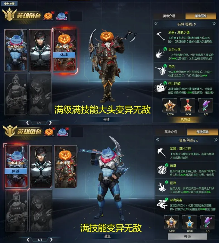 英雄角色:丧钟(满级满技能)、鲨皇(满技能)
