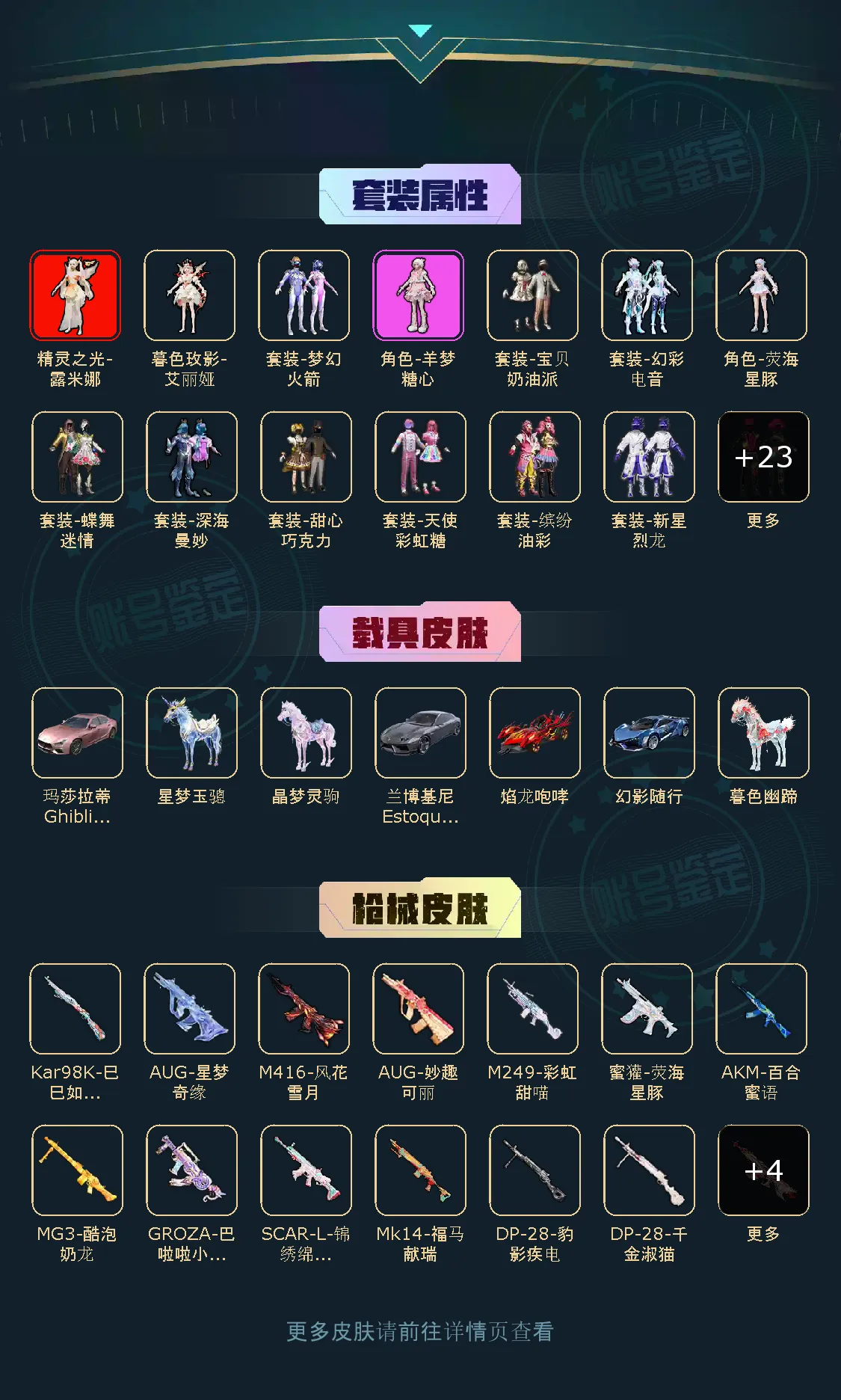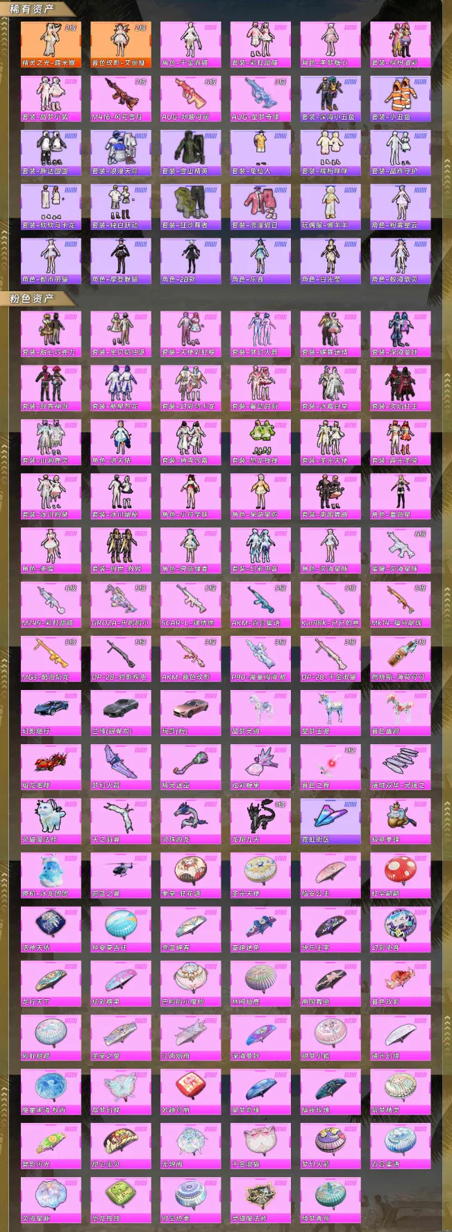 【稀有资产】精灵之光-露米娜[2级]/暮色玫影-艾丽娅[2级]/角色-千金淑猫/套装-彩虹甜喵/角色-羊梦糖心/套装-缤纷油彩/套装-甜梦小狐/M416-风花雪月/AUG-妙趣可丽/AUG-星梦奇缘/套装-深海小丑鱼/套装-小丑鱼/套装-胖达圆圆/套装-浪漫天命/套装-雪山精英/套装-龟仙人/套装-糯粉咩咩/套装-晶辉守护/套装-软软马卡龙/套装-纯白跃动/套装-狂沙舞者/套装-浪漫假日/玩偶服-懒羊羊/角色-粉雾星云/角色-都市丽猫/角色-摩登魅猫/角色-2B战斗服款/角色-乐音/角色-白光莹/角色-鲛海歌灵