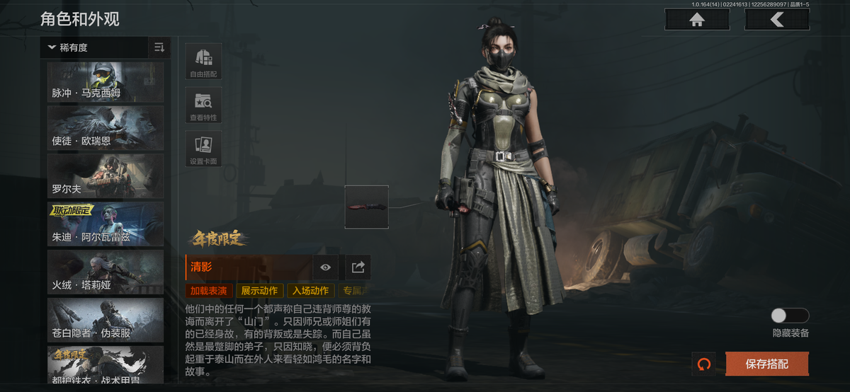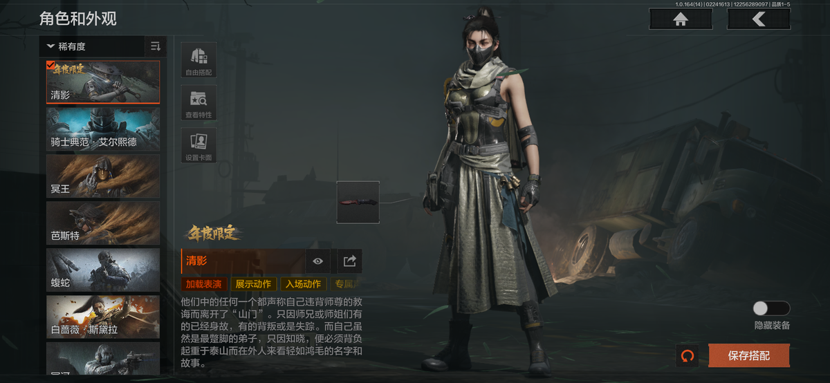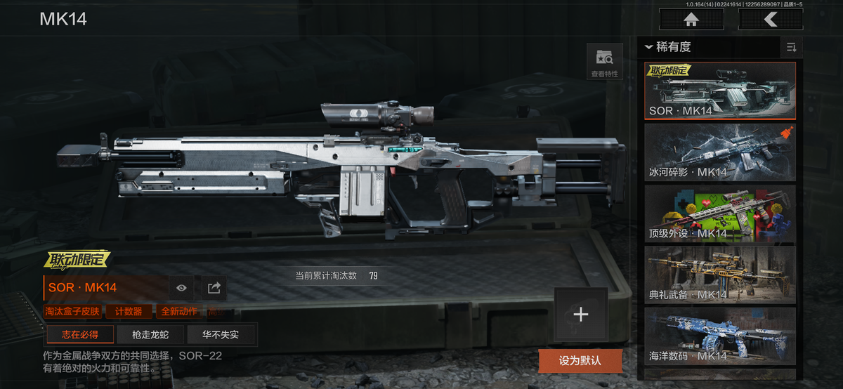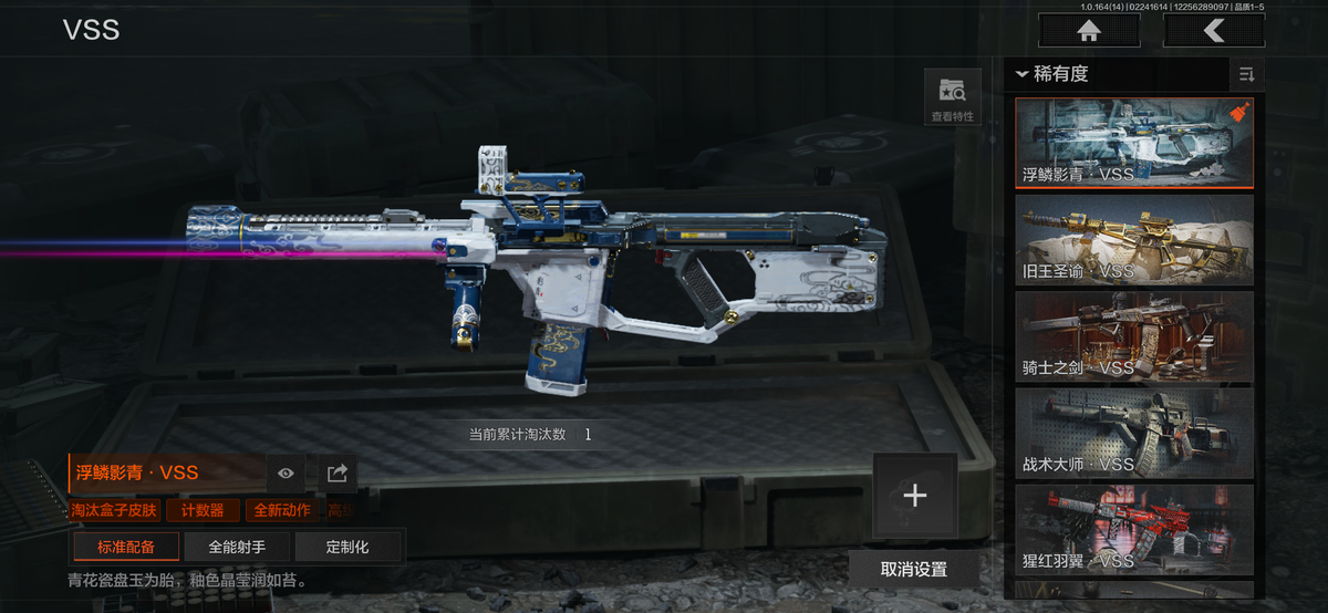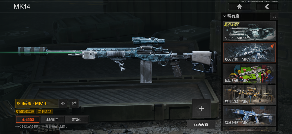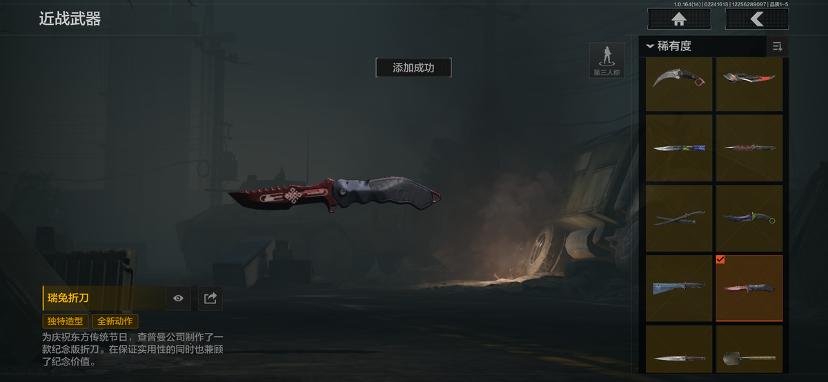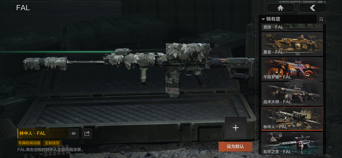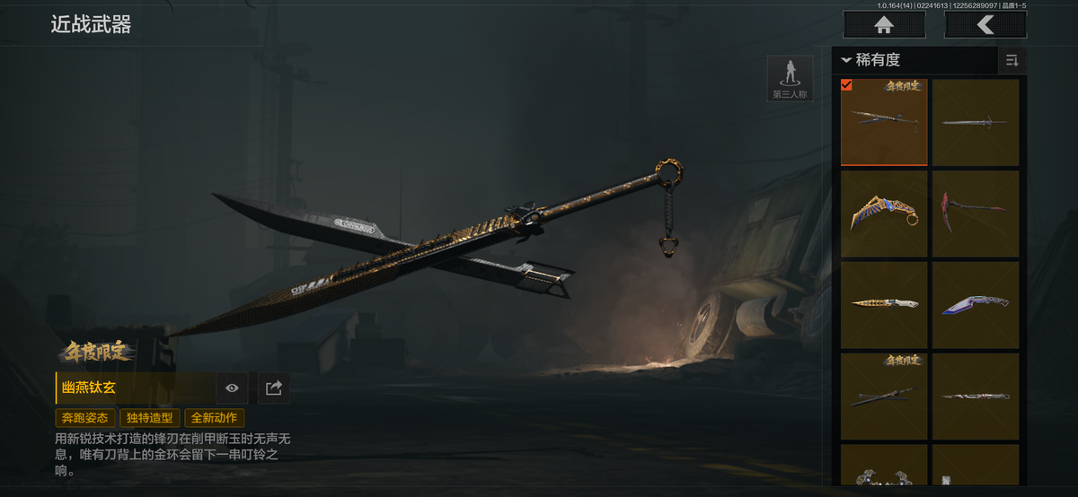 近战武器:瑞兔折刀,涂鸦利刃,明刀绣春,急袭弯刀,胜利军刀,下弦月,三尺万仞战术剑,霜狼生存刀,贝利亚黄昏,寒牙手刺,突击匕首,盘牙彻甲短刃,旧日主宰,瀚星斩铁,来战开山刀,工兵铲,赢家匕首,苍穹利爪,收割者,幽燕钛玄,百炼恒常;手套:急袭手套,苍白之触,玉鸾挂枝手套,角弓得控手套,噤声者作战手套;角色套装:清影,骑士典范艾尔西德,冥王,芭斯特,火绒塔莉娅,绅士西服,朱迪阿尔瓦雷兹,都护铁衣战术甲胄,绕指玉鸾战术甲胄,深潜行者lI,苍白隐者伪装服,噤声者吉利服,矿山霸主常服,罗尔夫,冥河,白蔷薇斯黛拉,脉冲马克西姆,蝮蛇,使徒欧瑞恩,万众狂欢套装,枪皮:SORMK14,浮鳞影青VSS,午夜梦魔FAL,战术大师FAL,林中人FAL,竞技FAL,蓝色咆哮H416,黄金H416,伦琴幻影H416,冬夜AK12,水果AR57,银月AN94,伸冤者迷踪M4A1,黄金M4A1,黄金AK74N,战术大师AK102,竞技H416,黄金FAL,告丧夜曲AUG,告丧夜曲AR57,I旧王圣谕QBZ191,浮鳞影青QBZ192,玉擎天工AN94,利齿风暴MPX,长缨风掣Vector9,黑金弹头P90,玉擎天工MP5,冰河碎影MK14,骑士之剑VSS,战术大师VSS,旧王圣谕VSS,棱光裂变QBU191,长缨风掣AX50,骑士之剑AX50,长缨风掣RPK16,骑士之剑MK14,涂鸦G18C;