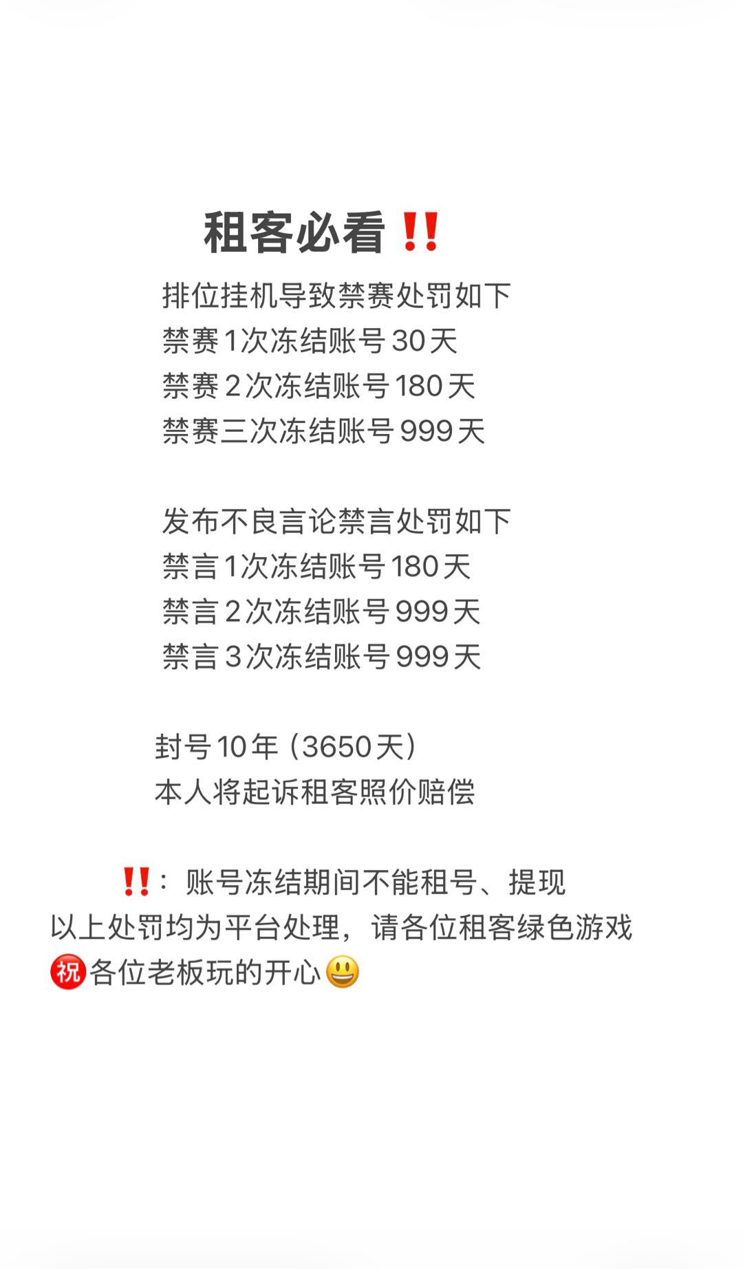 导致账号封禁10年本人将起诉平台索要租客身份证及其他资料信息,起诉至法院,请租客绿色游戏,不要给自己填不必要的麻烦哦