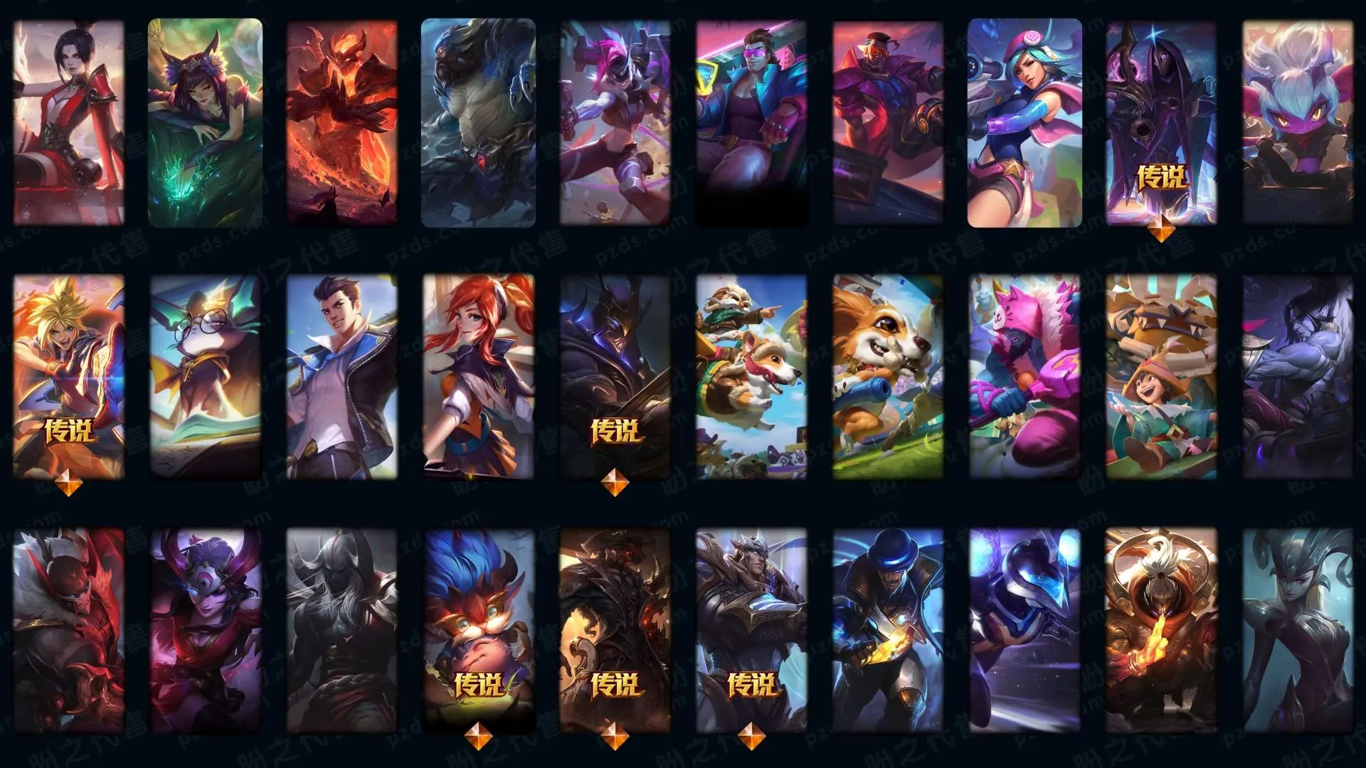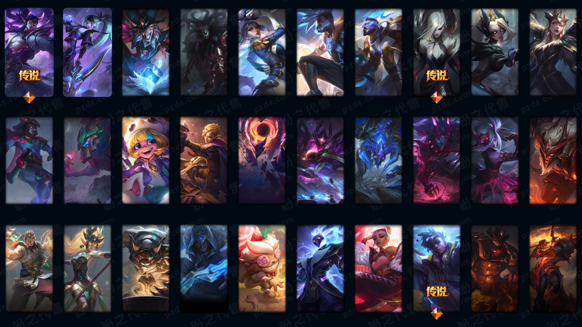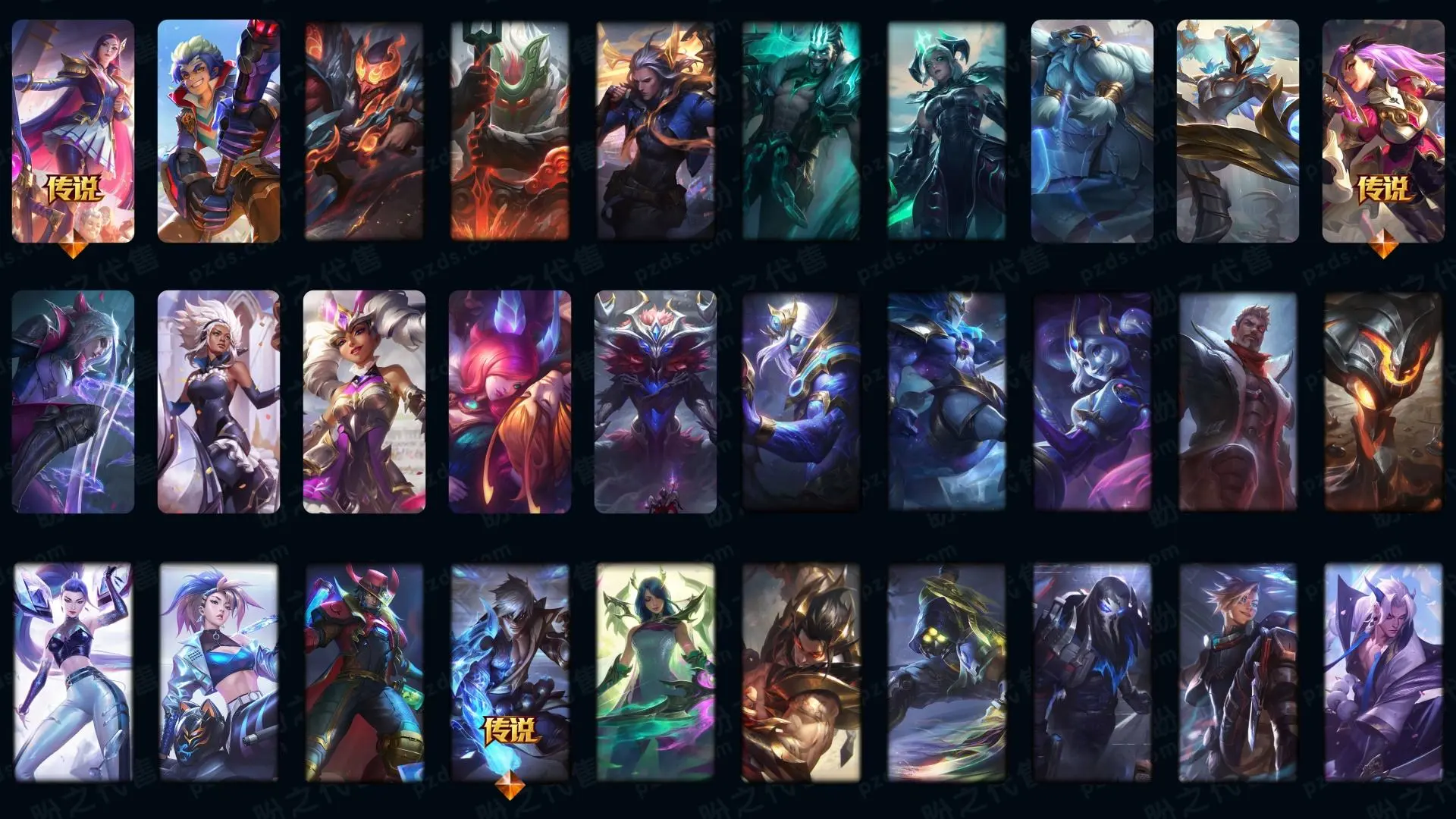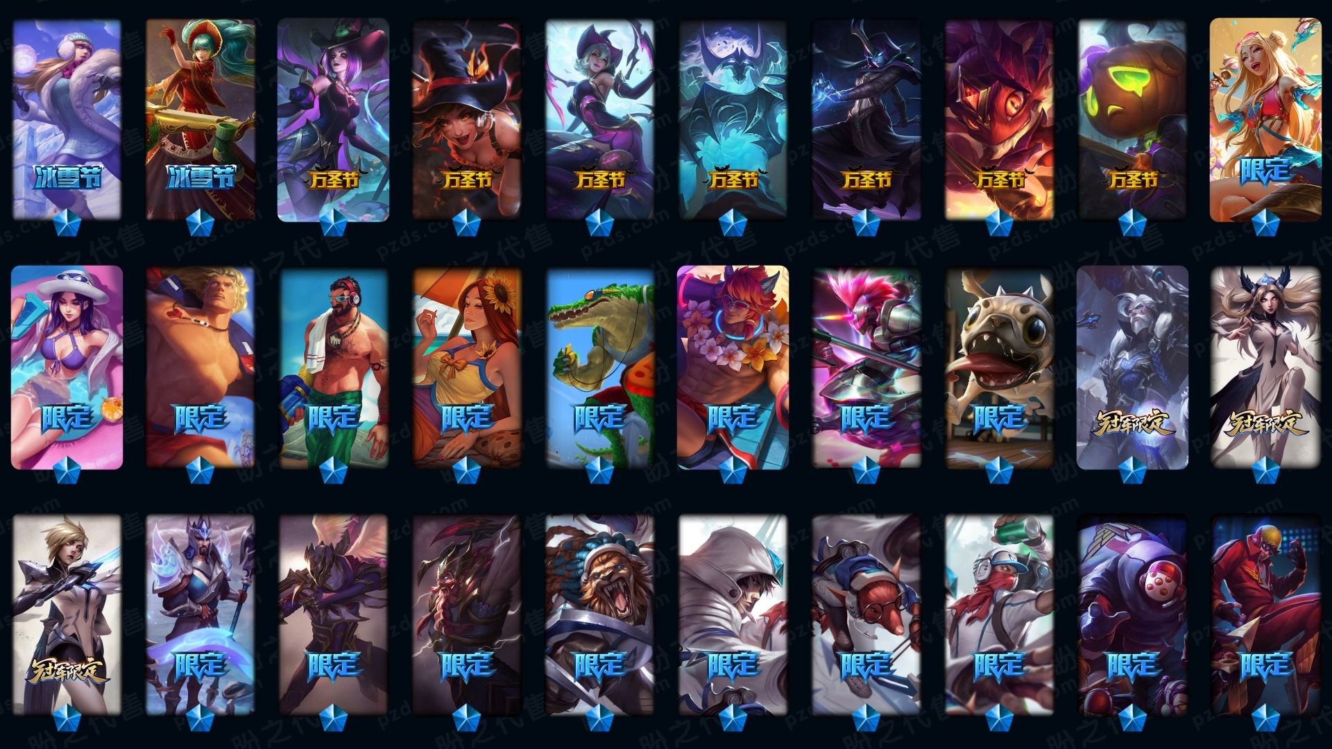 【传说皮肤】枯萎之壤泽拉斯 真实伤害艾克 神龙尊者夜月幻龙亚索 星之守护者霞 战斗学院凯特琳 至尊魔女莫甘娜 源计划联合艾希 日蚀骑士希维尔 神龙尊者圣龙李青 冰川巨兽墨菲特 欧米伽小队幽灵特工 黯黑魔龙希瓦娜 奥德赛凯隐 红色男爵库奇 驯龙学者黑默丁格 律政大亨蒙多 西部魔影卢锡安 地狱行者孙悟空 蔷薇绅士杰斯 星之守护者阿狸 女警狙击凯特琳 霸天异形卡兹克 源计划超体莫德凯撒 电玩女神娑娜 地狱之门卫士加里奥 死亡骑士盖伦 银河魔装机神兰博 恶魔男爵瑞兹 大天使长米迦勒凯尔 神王盖伦 黎明使者锐雯 最终BOSS维迦 战场女武神凯尔 第三类接触黑默丁格 战地机甲厄加特 女校长菲奥娜 女主播迦娜 邪鸦魅影乐芙兰 战斗学院伊泽瑞尔 宇航员诺提勒斯 影执事劫 源计划净化薇恩 血石领主弗拉基米尔 黯晶凤凰艾尼维亚 灵魂莲华锤石 天煞劫 战地巨兽科加斯 苍穹之光韦鲁斯 屠龙勇士潘森 约德尔国队长提莫 神拳李青 符文战熊沃利贝尔 未来战士凯特琳 女帝卡特琳娜 陆地王者4WD布里茨 合金巨兽努努和威朗普 黑夜使者亚索 魔幻卡牌崔斯特 太空律动猫猫布里和里茨 源计划林易 丧尸布兰德 腥红之月鬼武姬阿卡丽 神王德莱厄斯 灌篮高手德莱厄斯 焰尾妖狐阿狸 铁哥们儿奥拉夫 绅士科加斯 暗星尊烬 女皇艾希 烈焰雄心崔丝塔娜