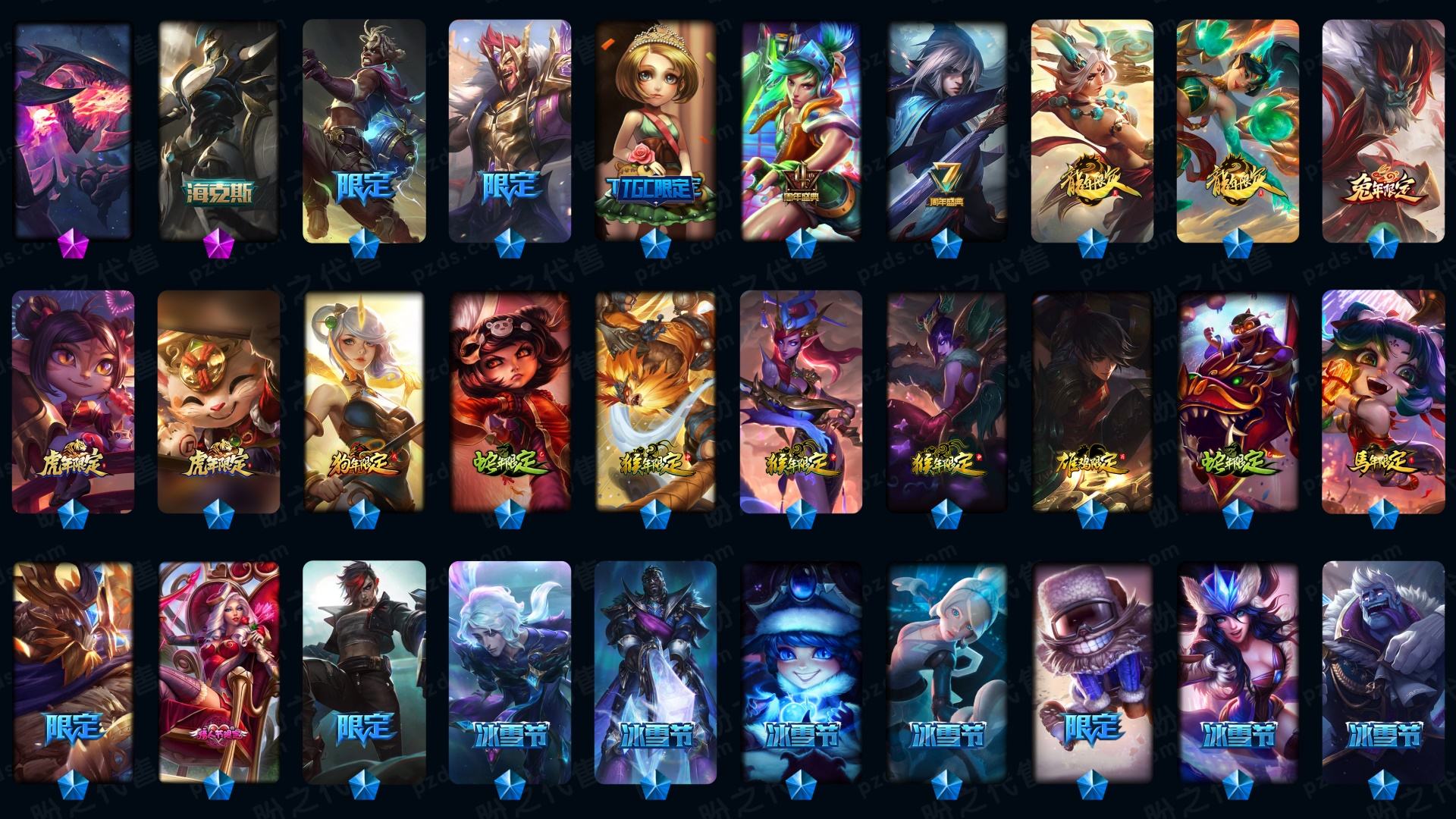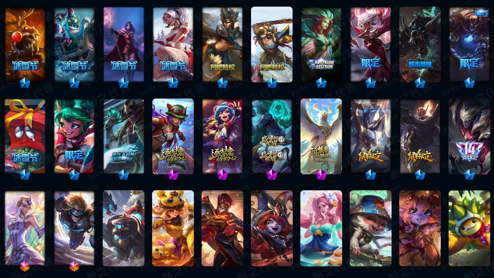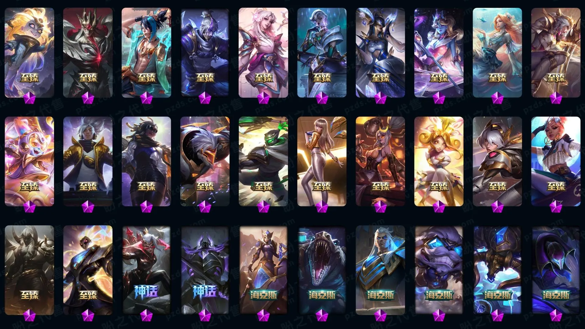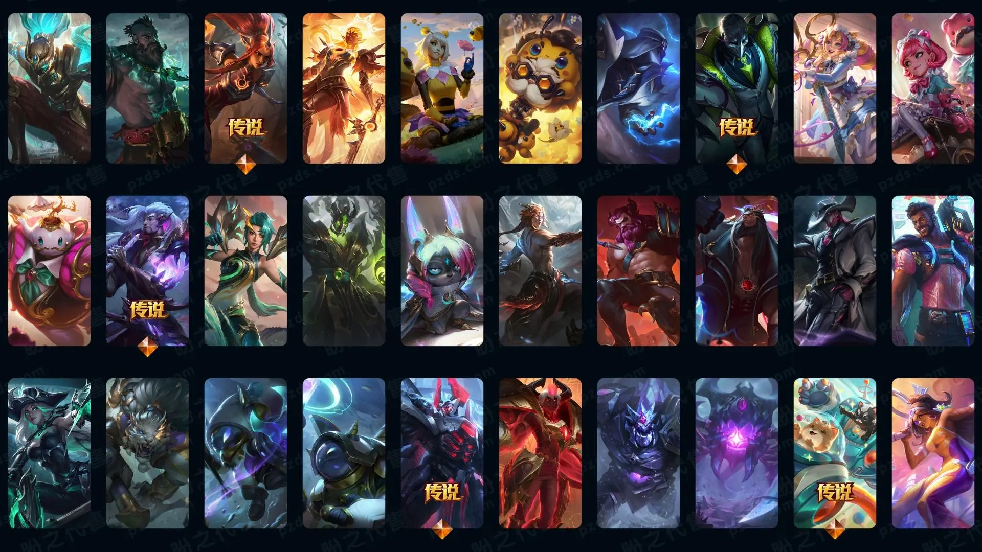 【传说皮肤】枯萎之壤泽拉斯 真实伤害艾克 神龙尊者夜月幻龙亚索 星之守护者霞 战斗学院凯特琳 至尊魔女莫甘娜 源计划联合艾希 日蚀骑士希维尔 神龙尊者圣龙李青 冰川巨兽墨菲特 欧米伽小队幽灵特工 黯黑魔龙希瓦娜 奥德赛凯隐 红色男爵库奇 驯龙学者黑默丁格 律政大亨蒙多 西部魔影卢锡安 地狱行者孙悟空 蔷薇绅士杰斯 星之守护者阿狸 女警狙击凯特琳 霸天异形卡兹克 源计划超体莫德凯撒 电玩女神娑娜 地狱之门卫士加里奥 死亡骑士盖伦 银河魔装机神兰博 恶魔男爵瑞兹 大天使长米迦勒凯尔 神王盖伦 黎明使者锐雯 最终BOSS维迦 战场女武神凯尔 第三类接触黑默丁格 战地机甲厄加特 女校长菲奥娜 女主播迦娜 邪鸦魅影乐芙兰 战斗学院伊泽瑞尔 宇航员诺提勒斯 影执事劫 源计划净化薇恩 血石领主弗拉基米尔 黯晶凤凰艾尼维亚 灵魂莲华锤石 天煞劫 战地巨兽科加斯 苍穹之光韦鲁斯 屠龙勇士潘森 约德尔国队长提莫 神拳李青 符文战熊沃利贝尔 未来战士凯特琳 女帝卡特琳娜 陆地王者4WD布里茨 合金巨兽努努和威朗普 黑夜使者亚索 魔幻卡牌崔斯特 太空律动猫猫布里和里茨 源计划林易 丧尸布兰德 腥红之月鬼武姬阿卡丽 神王德莱厄斯 灌篮高手德莱厄斯 焰尾妖狐阿狸 铁哥们儿奥拉夫 绅士科加斯 暗星尊烬 女皇艾希 烈焰雄心崔丝塔娜
