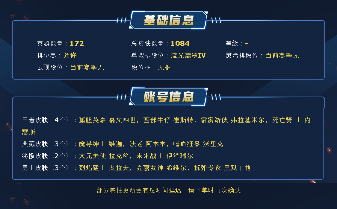 ~~喜欢记得收藏~~1100皮全英雄~~租之前尽量查一下游戏ID,确保段位是您需要的,避免浪费您的时间~~请勿挂机逃跑故意送人头,谢谢合作,谢谢~~