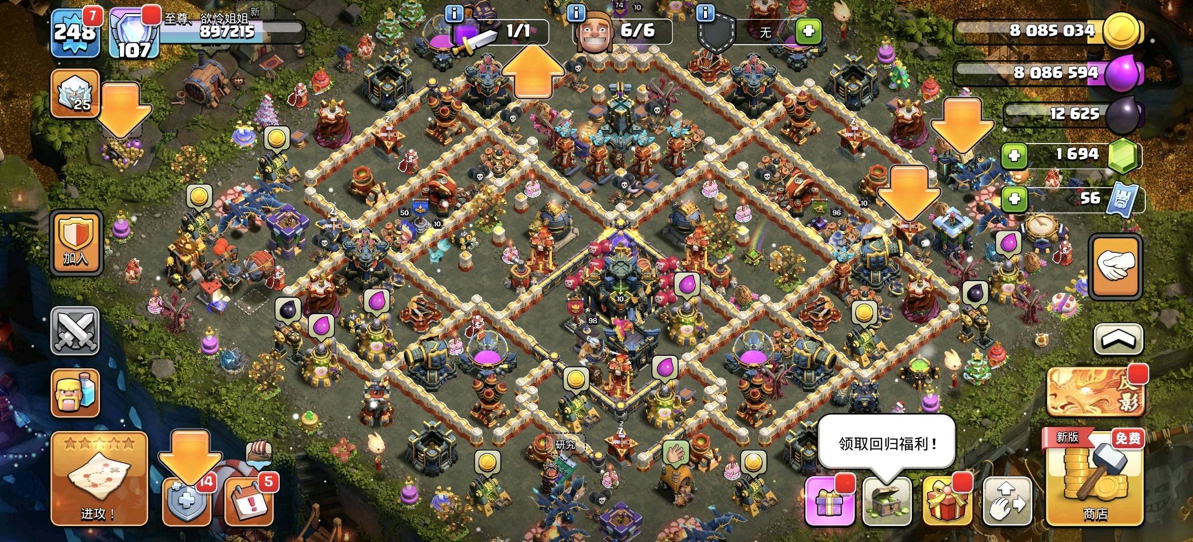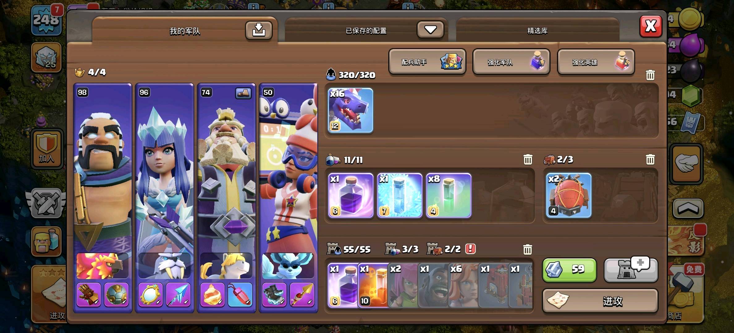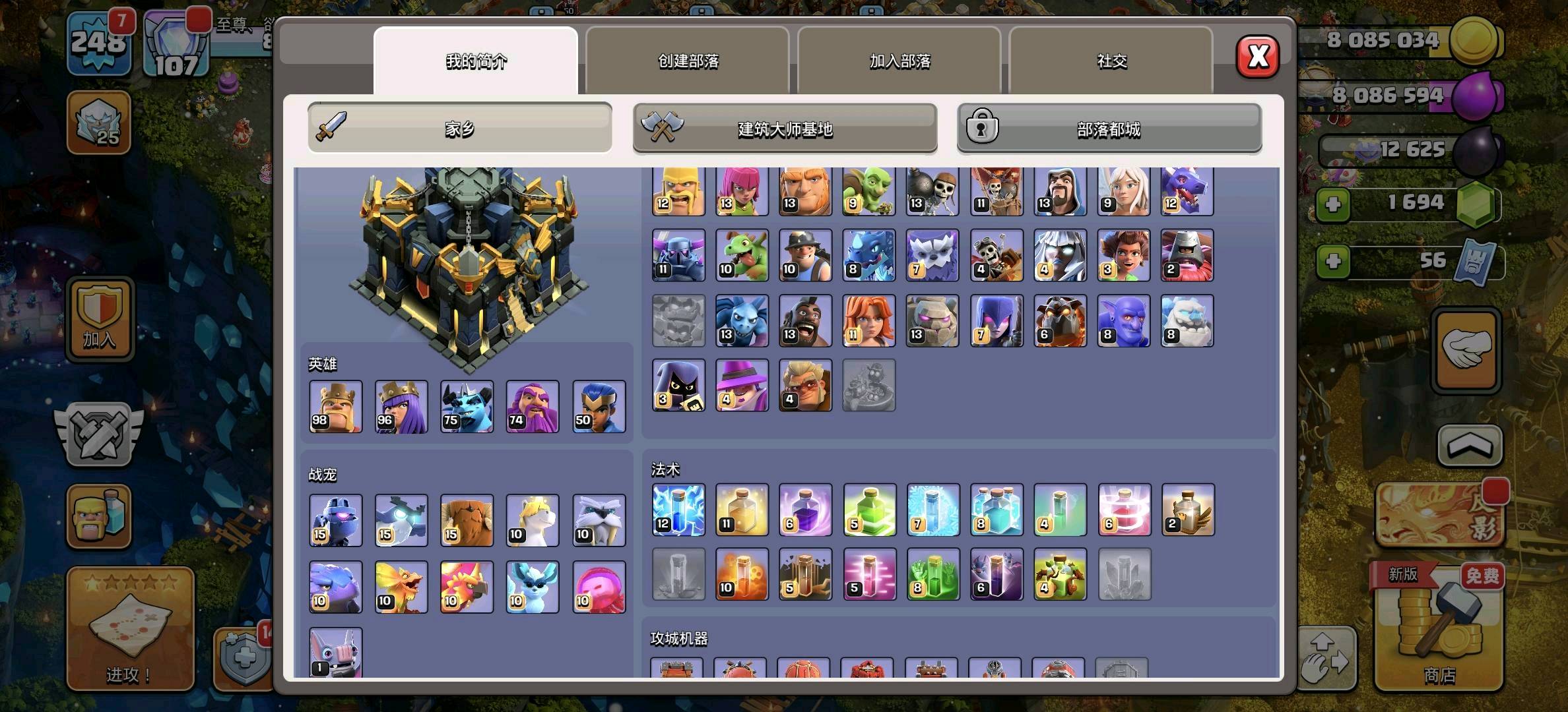 部落冲突q区,248级,17本高防。英雄98,96,74,50。