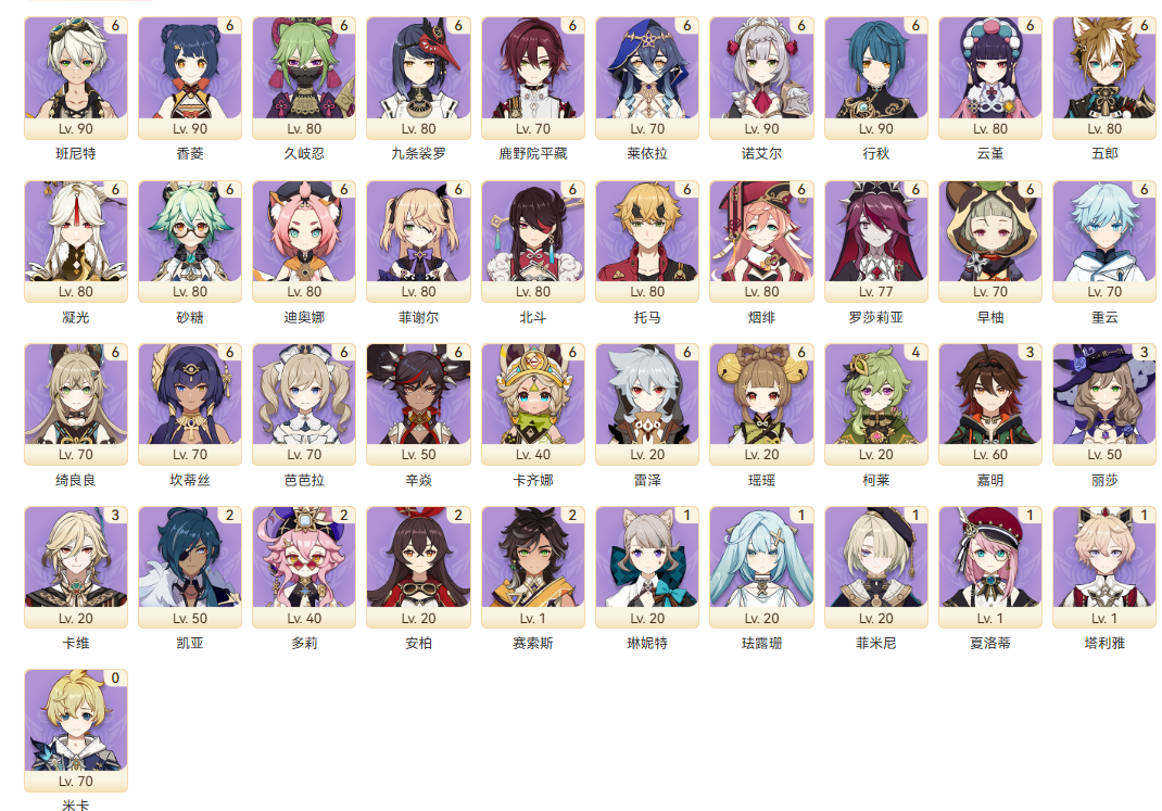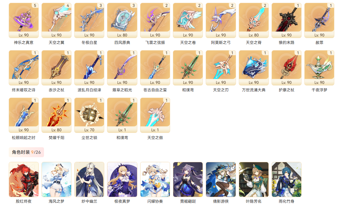 等级60 黄数131 主角女主 五星角色33 五星武器25 圣遗物1950 时装数量9