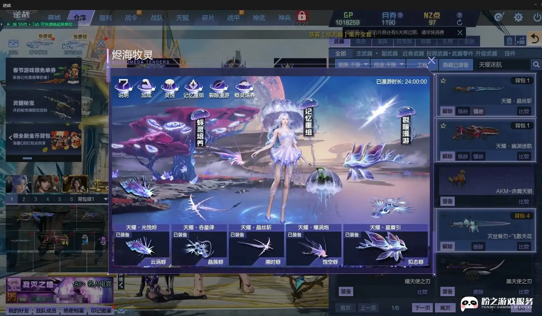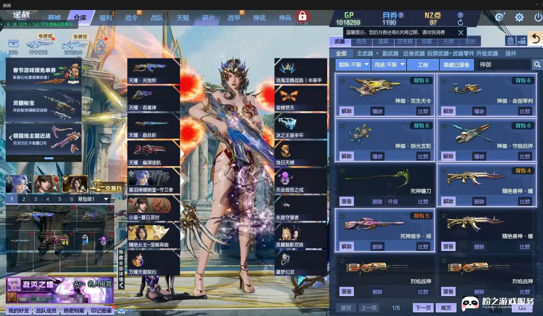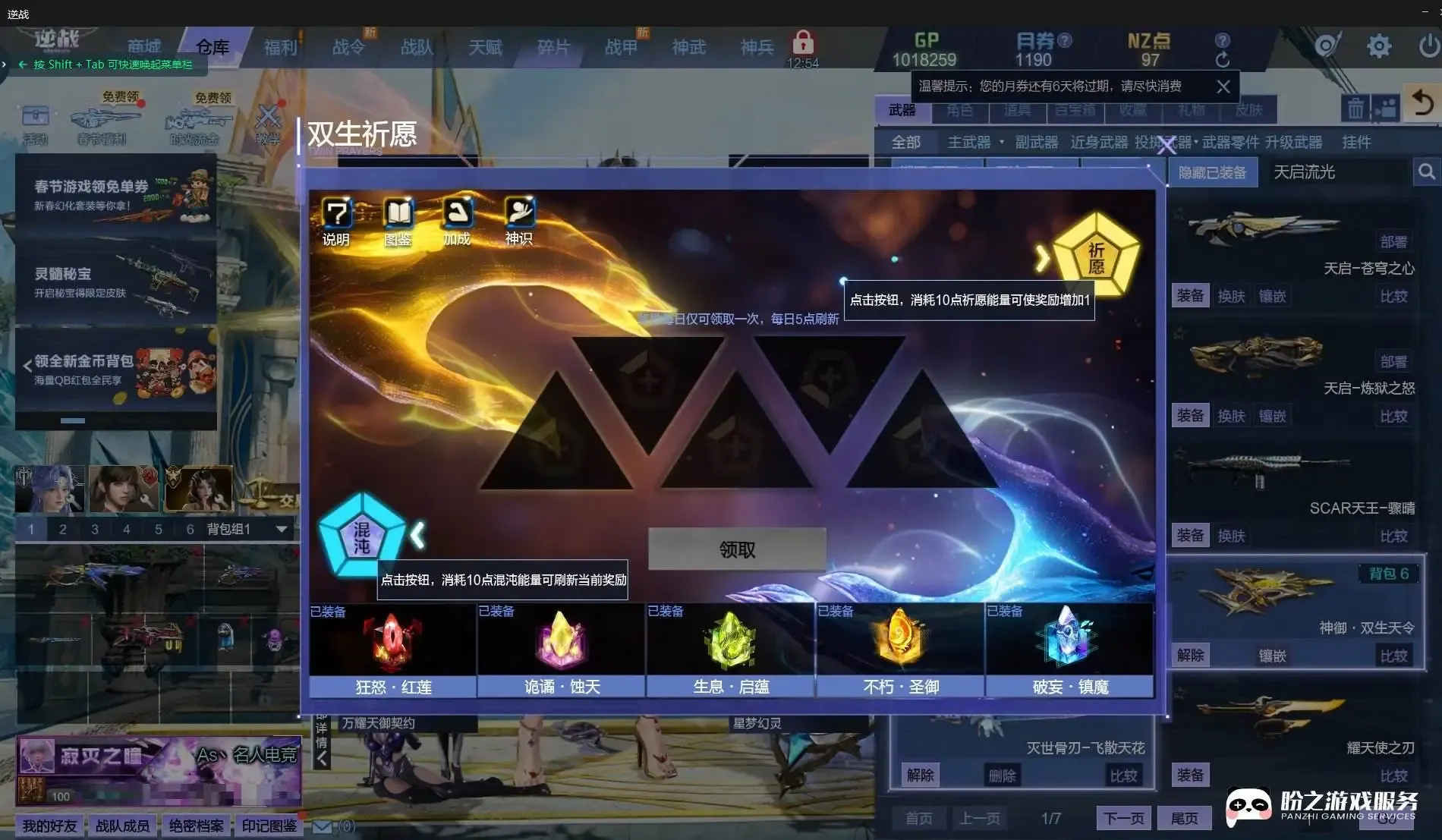 神御套/天耀套/星寰套/山海套/幻域套/陨星套/鹰王套/天启-炼狱之怒/天启-四律之陨/天启-终末之刃/天启-苍穹之心/湮灭之影-流光/诸神黄昏-鹰隼之劫/鼠灵拳刃/鼠灵手雷/虎王81式/哮天犬-风轮/哮天犬-爆空/甜心萌兔双剑/甜心萌兔手雷
