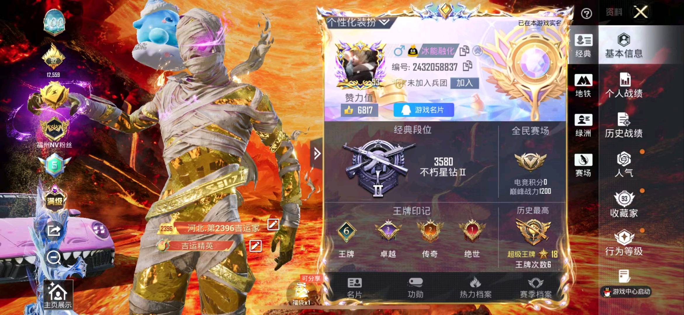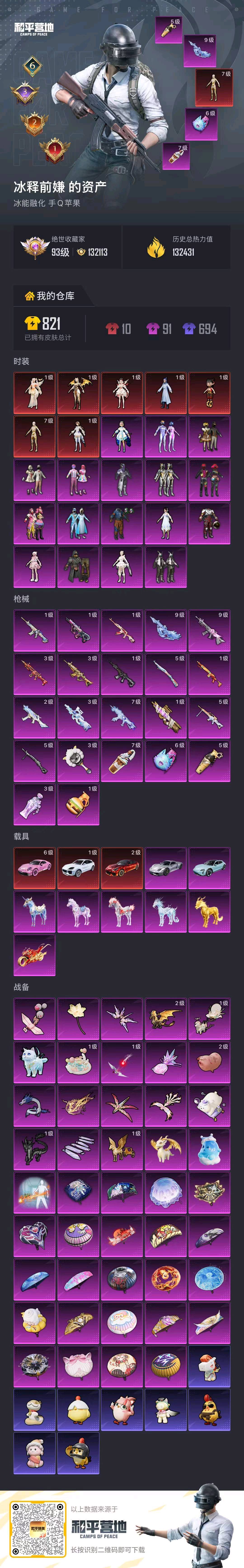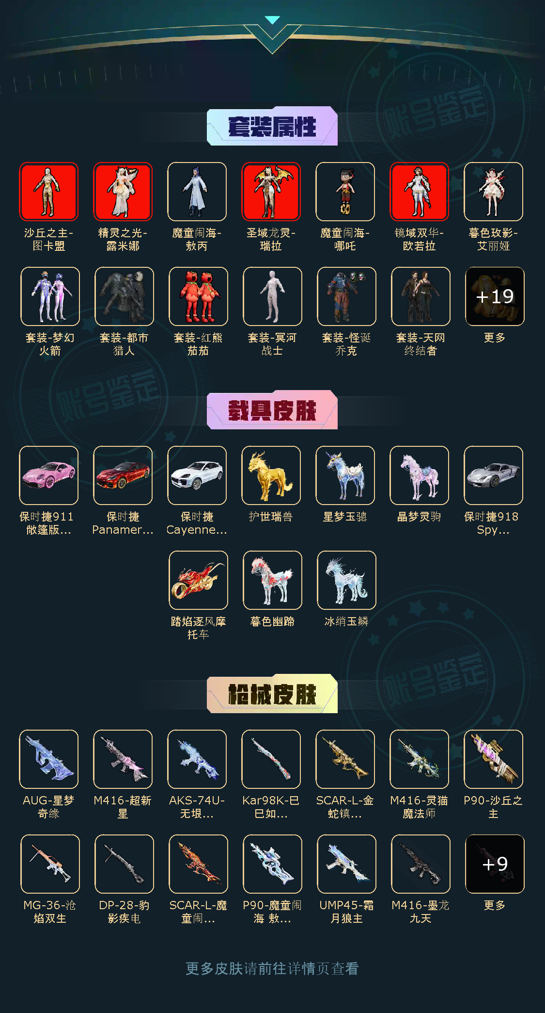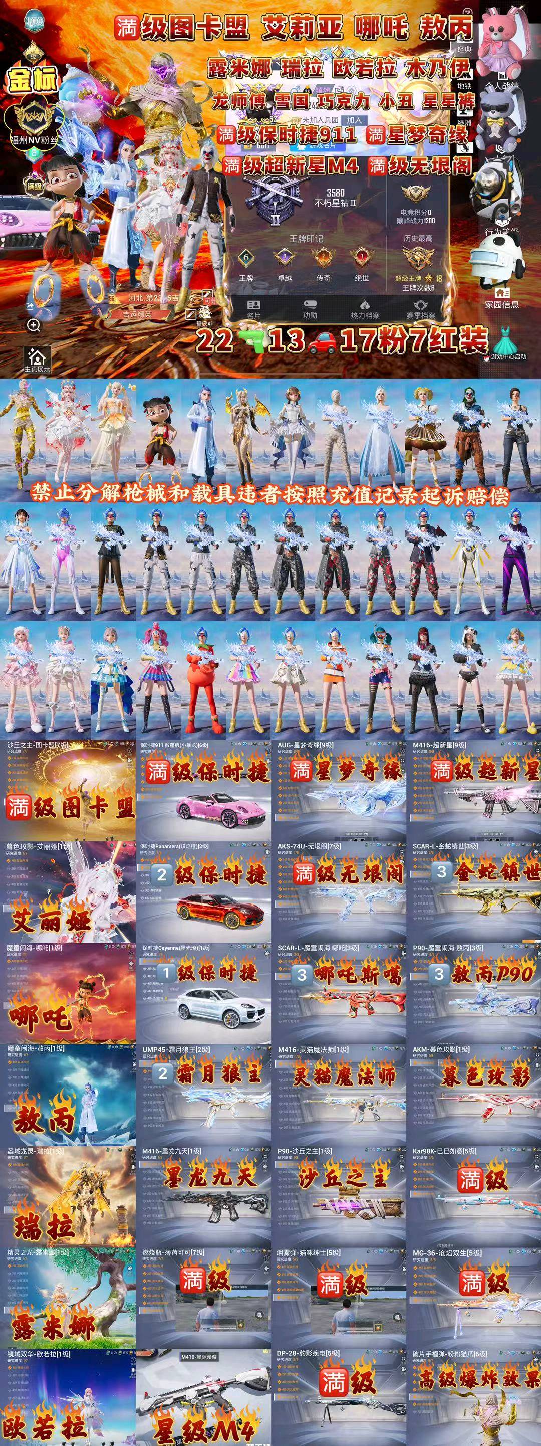 不朽星钻Ⅱ24粉,11载具,137套装,6王牌印记,超级王牌18星历史最高段,132431热力值 平底锅-喜羊羊与灰太狼/M416-灵猫魔法师/AUG-星梦奇缘/M416-墨龙九天/SCAR-L-金蛇镇世/M416-超新星/SCAR-L-魔童闹海 哪吒/AUG-罪夜之冕/AKM-暮色玫影/Mk14-福马献瑞/MG-36-沧焰双生/DP-28-豹影疾电/P90-沙丘之主/AKS-74U-无垠阁/P90-魔童闹海 敖丙/烟雾弹-丁香清露/破片手榴弹-热量炸弹/烟雾弹-猫咪绅士/破片手榴弹-粉粉猫爪/燃烧瓶-薄荷可可/Kar98K-巳巳如意/保时捷Panamera(炽焰橙)/保时捷911 敞篷版(小暴龙)/保时捷Cayenne(星光璃)/保时捷Taycan 旅行版(冰晶蓝)/保时捷918 Spyder(液态银)/暮色幽蹄/冰绡玉鳞/护世瑞兽/星梦玉骢/晶梦灵驹/踏焰逐风摩托车/