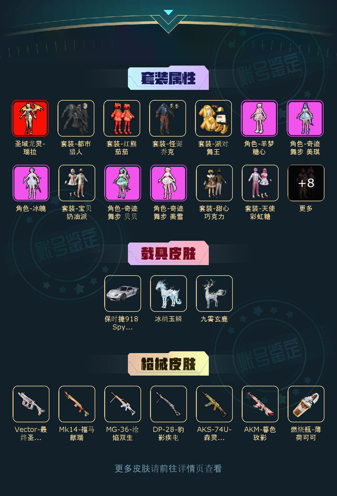 超级王牌10星18粉,3载具,122套装,8王牌印记,卓越王牌18星历史最高段,55761热力值 AKM-暮色玫影/Mk14-福马献瑞/MG-36-沧焰双生/DP-28-豹影疾电/Vector-最终圣卫者/AKS-74U-森灵之息/燃烧瓶-薄荷可可/保时捷918 Spyder(液态银)/冰绡玉鳞/九霄玄鹿/