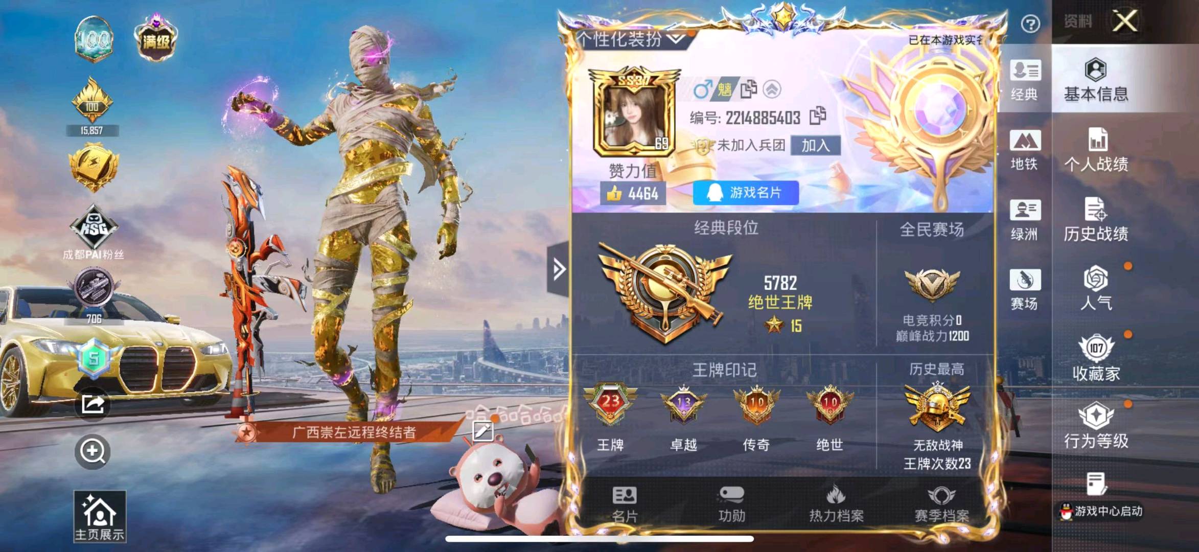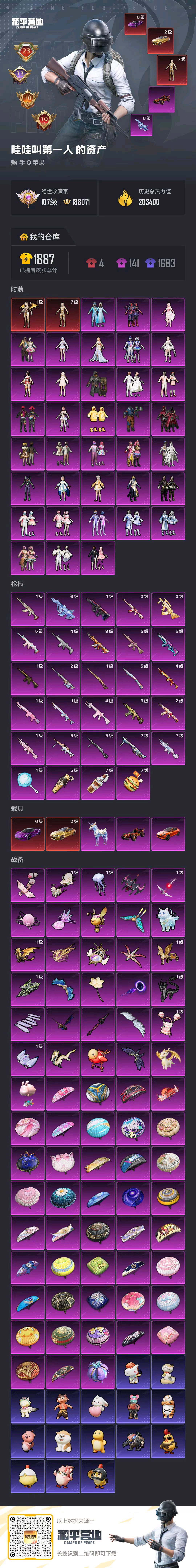 绝世王牌15星38粉,5载具,356套装,23王牌印记,无敌战神历史最高段,203400热力值 平底锅-仲夏莫吉托/AUG-星梦奇缘/AUG-星之彼岸/M762-鬼刀/M416-心之恋语/SCAR-L-纯梦嫁纱/M416-五爪金龙/GROZA-精灵之光/SCAR-L-锦绣绵绵/M416-至情至圣/AKM-梦之光华/AKM-暮色玫影/M417-第五大道/Mk14-精灵梦叶罗丽/Mk14-樱桃泡泡/Mk14-福马献瑞/M249-彩虹甜喵/MG3-洛神天依/M249-绝对恒星/MG-36-沧焰双生/DP-28-豹影疾电/AKS-74U-星穹咏叹调/AKS-74U-森灵之息/破片手榴弹-热量炸弹/烟雾弹-猫咪绅士/燃烧瓶-薄荷可可/Kar98K-圣域龙灵/Kar98K-巳巳如意/AMR-智耀战神/宝马M4(灿阳金)/阿斯顿·马丁DBX(橙)/合金龙骨(红)/路特斯EVIJA(电光紫)/星梦玉骢/